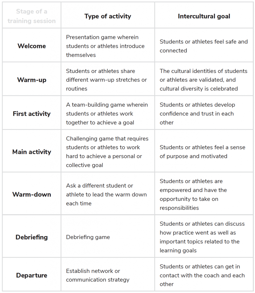 There are various opportunities to promote intercultural learning throughout a learning session. Using the example of a sport training session, the table below demonstrates how each phase of a typical sport training session can be used to promote intercultural learning. The structure proposed below can be adapted according to any situation. Many of the intercultural goals will take time to achieve, so it should not be expected that each goal can be achieved in a single learning session.