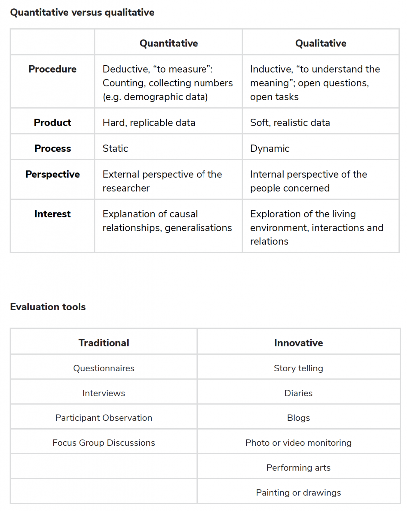 Sometimes, quantitative data alone are sufficient as the goals or outcomes might be reasonably simple to measure. More complex goals, such as increasing intercultural competences or social cohesion, are however likely to require qualitative or mixed approaches. While it may seem sometimes impossible to measure such intangible objectives, there are tools to support such evaluations. Below, we describe some of those tools.